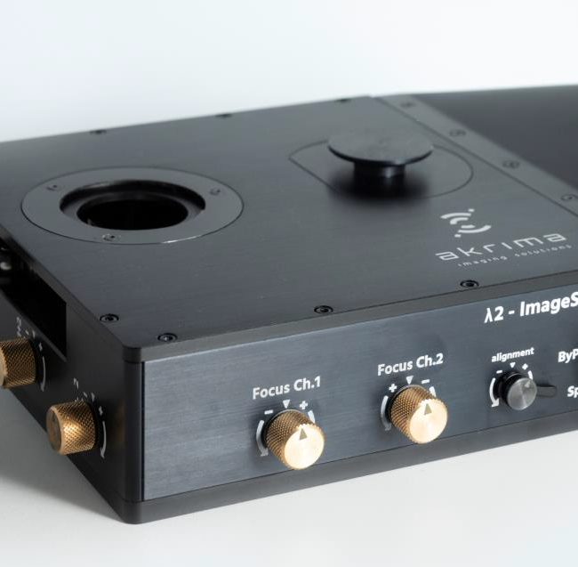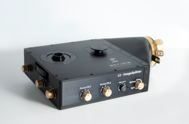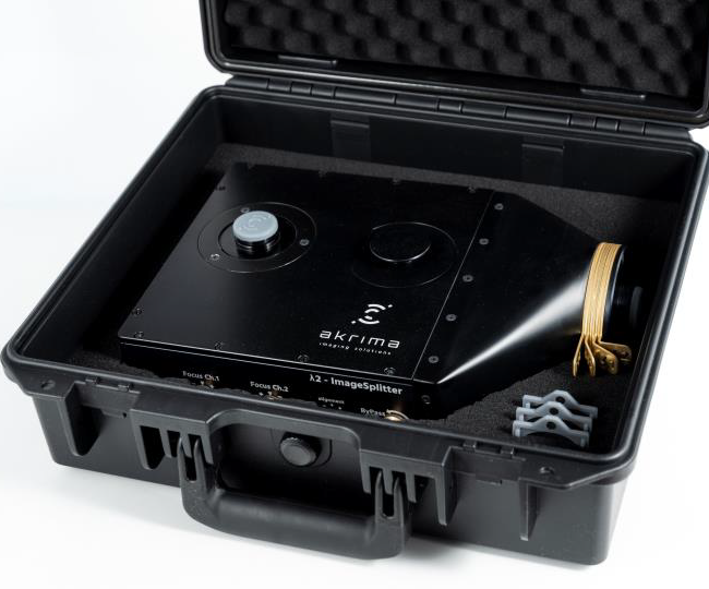 The λ2-ImageSplitter, a product of akrima company, is a dual-channel image splitting optical device tailored for fluorescence microscopy. It allows simultaneous capture of images across different channels (such as wavelengths) on a single camera sensor, eliminating the need for multiple cameras and addressing the issue of low temporal resolution in sequential imaging.