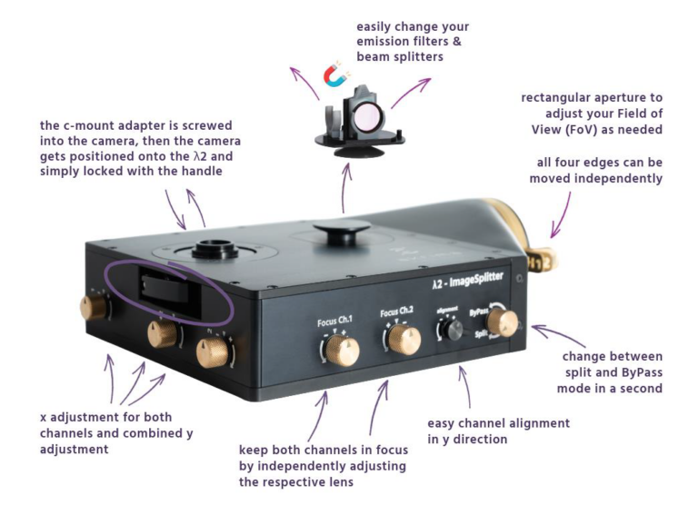 Ease of Use: The λ2-ImageSplitter offers image splitting and bypass for full chip imaging, quick tool-free setup and alignment in just a few minutes, user-friendly and intuitive handling, high-quality components and materials, and minimal distortion due to centrally passing through optical elements.